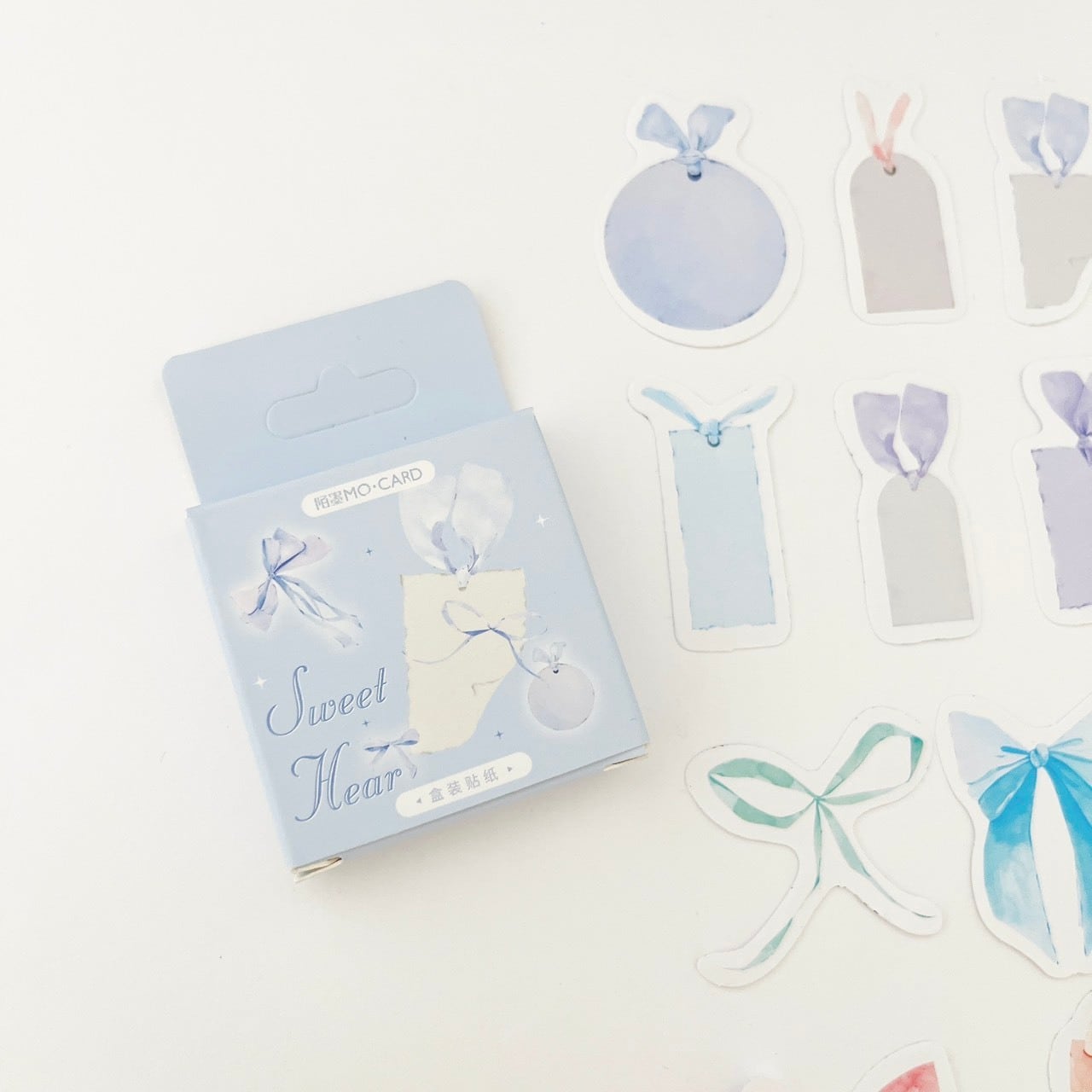 手のひらサイズの小さな箱の中にはリボンとしおりデザインのフレークシールが入っています。