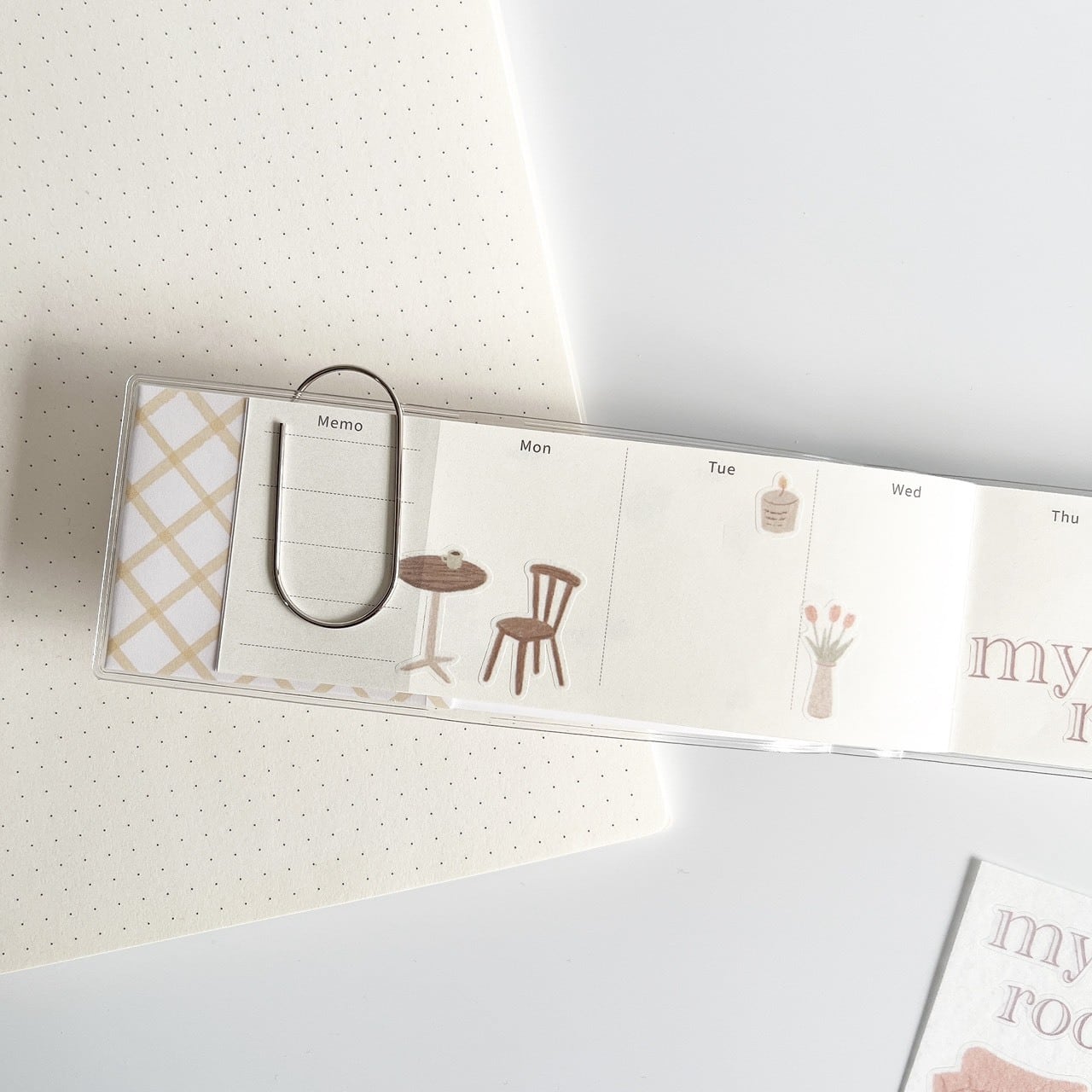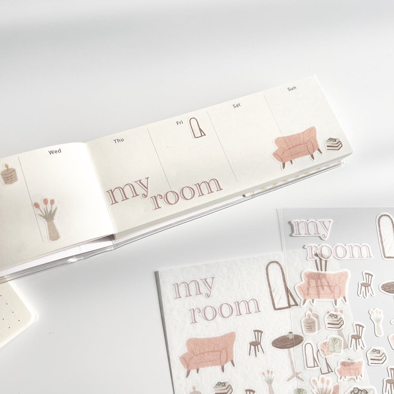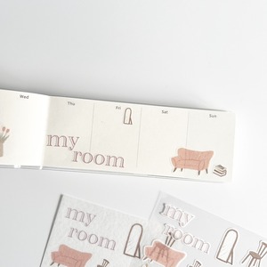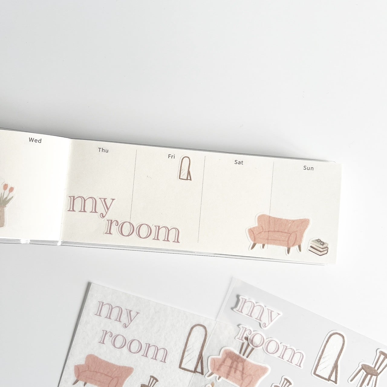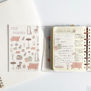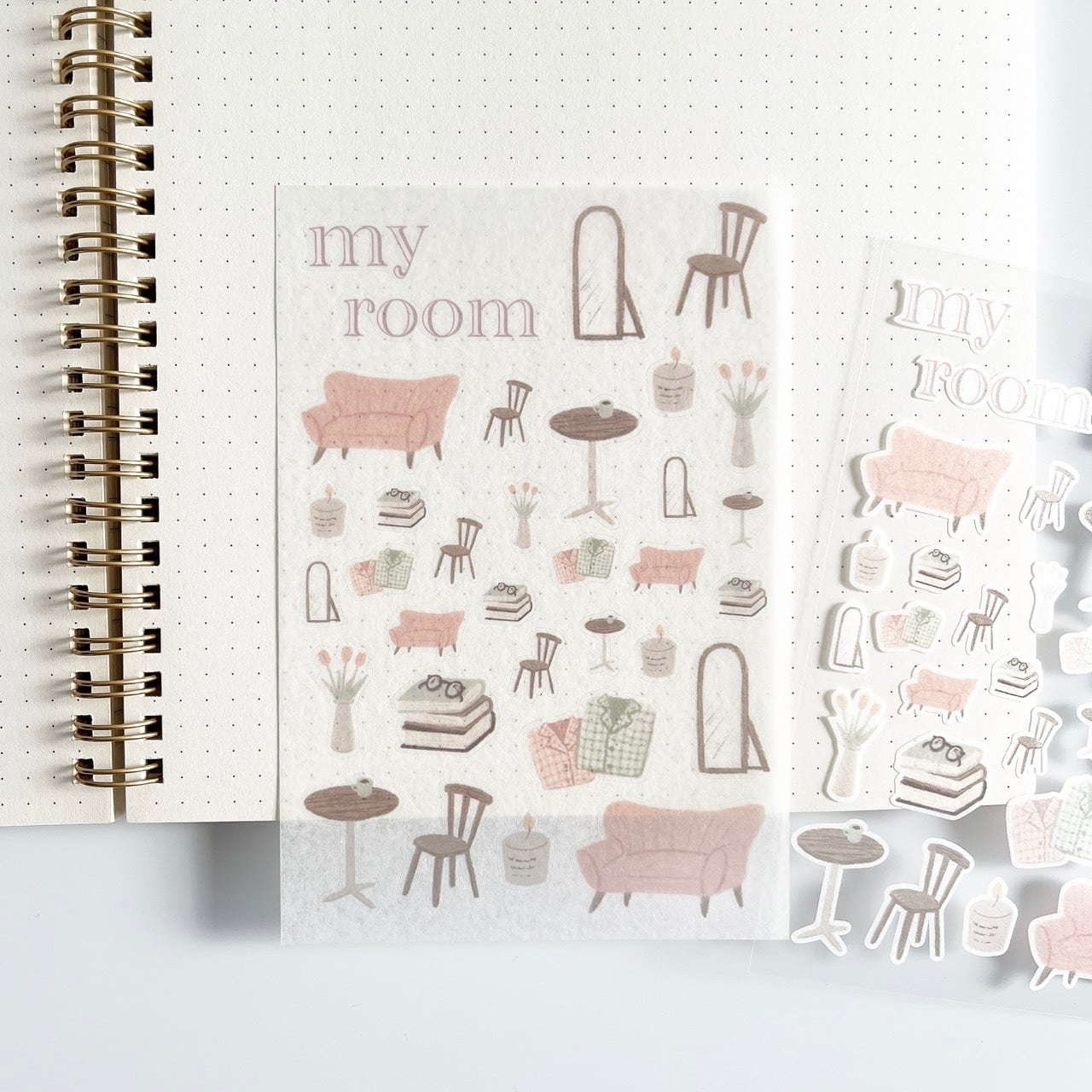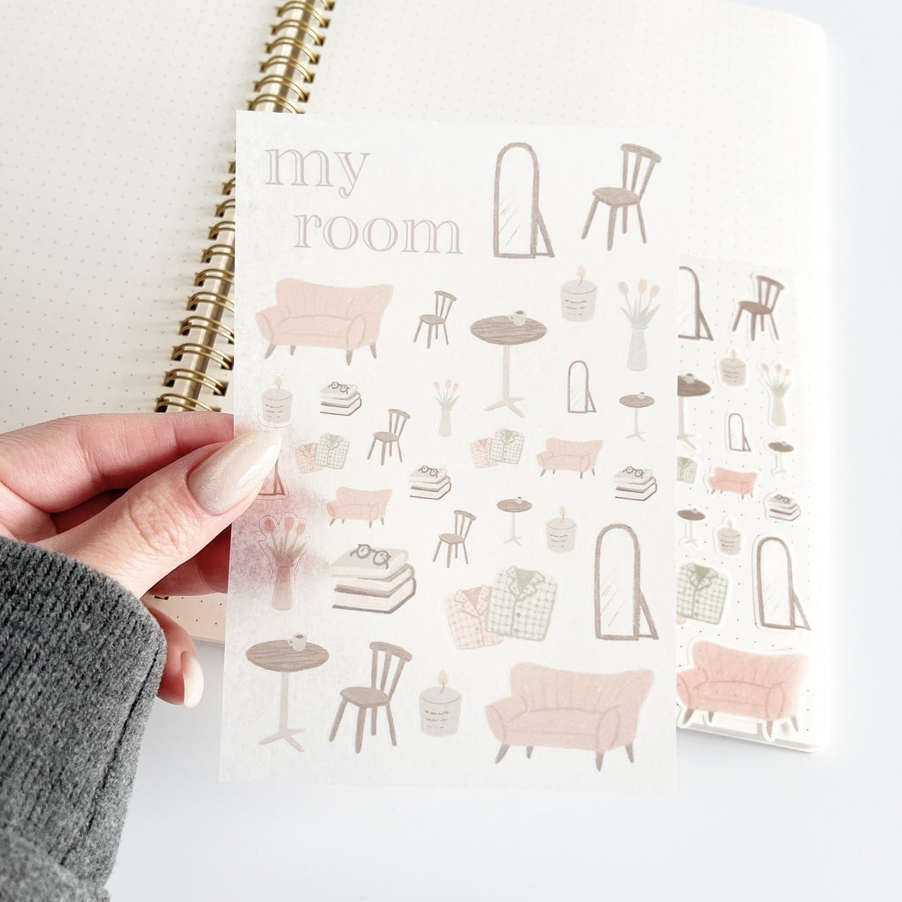 色鉛筆の繊細なタッチで描かれた、インテリアをテーマにしたステッカーです。