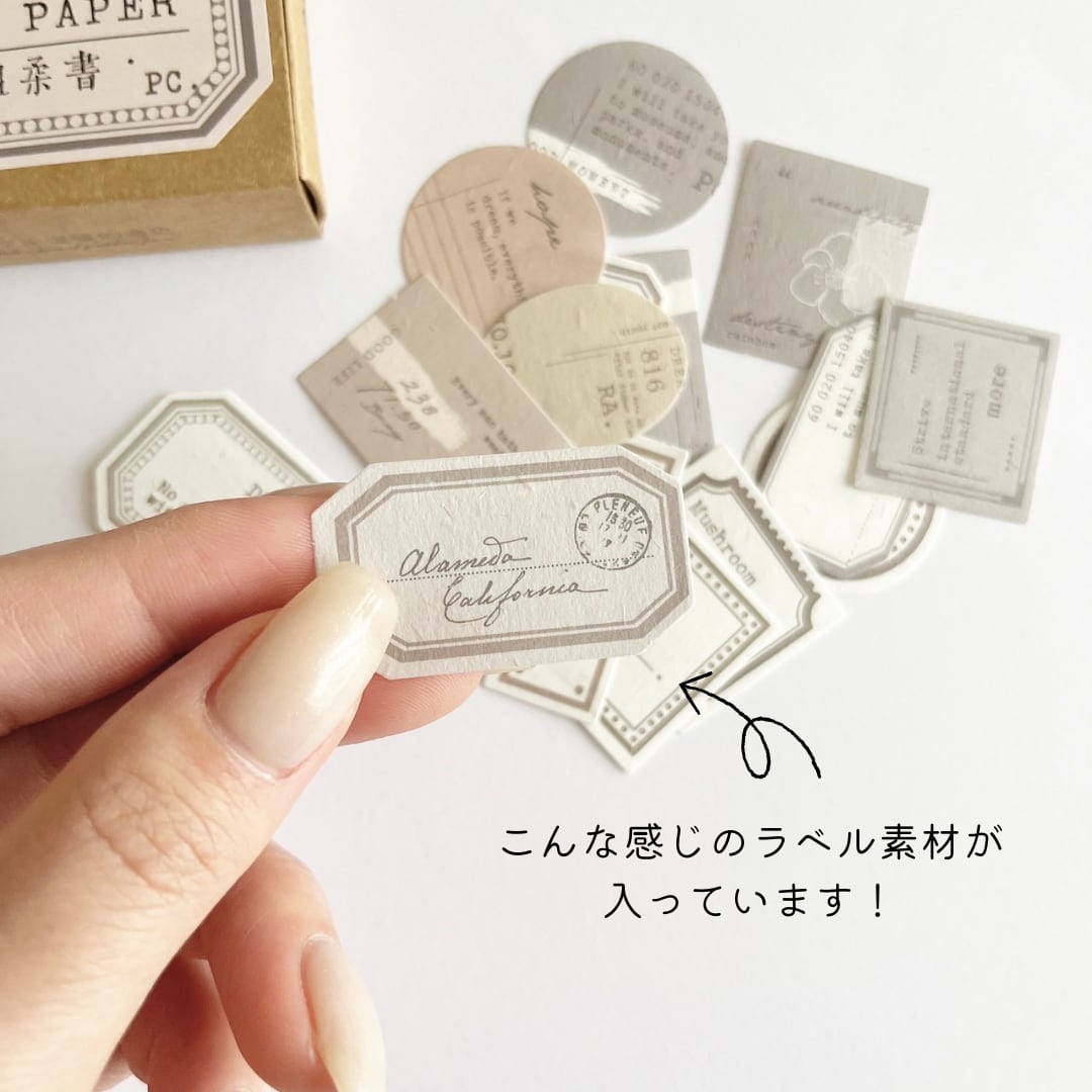 赤や緑の色合いがお好みの方にオススメです。変わった形のラベルが入っていて、一枚一枚小さいのでコラージュに向いています。